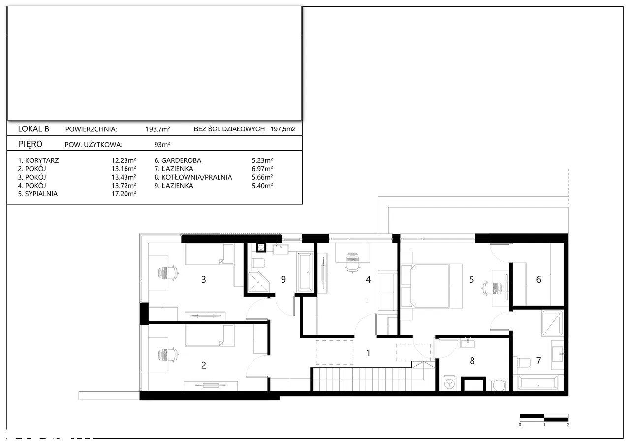 Na parterze znajduje się reprezentacyjna strefa dzienna m.in. przestronny salon, jadalnia, kuchnia z dużymi przeszkleniami i wyjściem na ogród, a na piętrze cztery sypialnie, w tym przestronna sypialnia główna, dwie łazienki.
