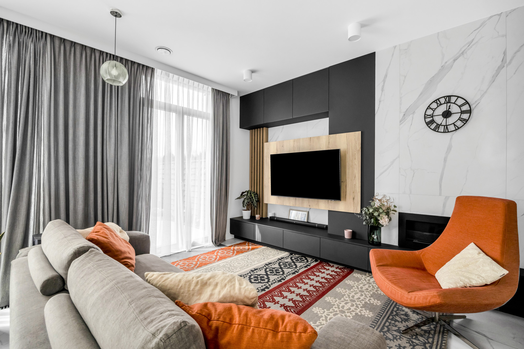 - large and sunny living room with kitchen and dining room (fully furnished),