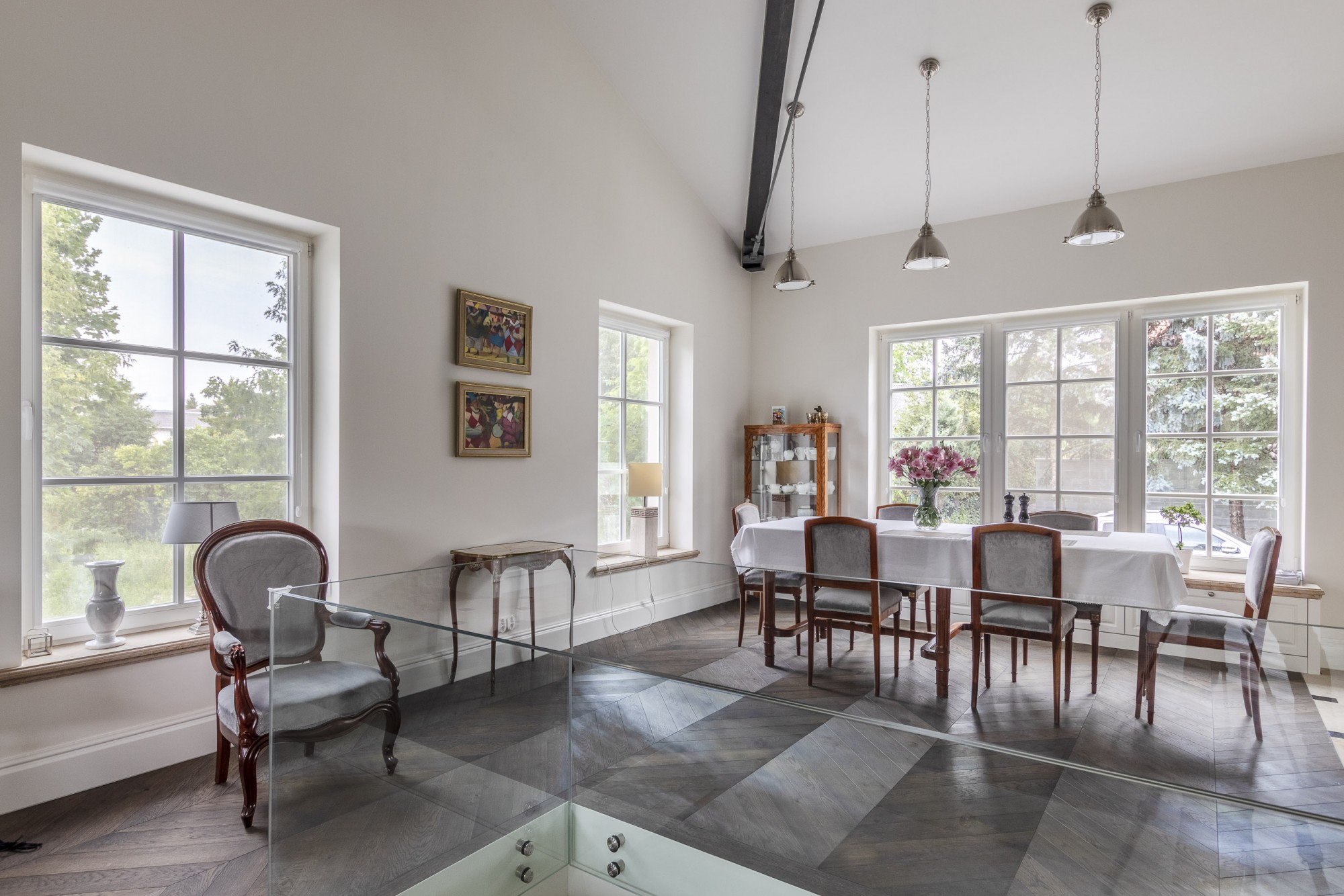 Nice, spacious and bright living room in the highest point of 5m, finished with the highest quality materials, house located in a quiet part of Wilanów.