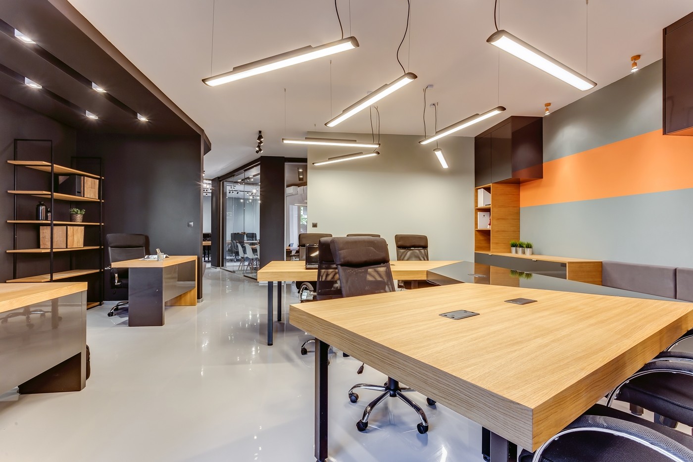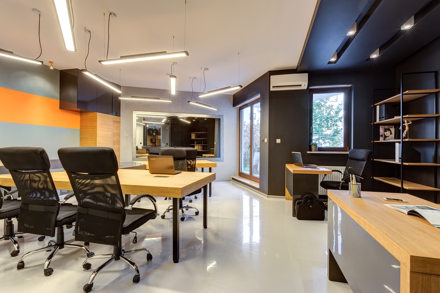 Biuro zostało wykończone w stylu nowoczesnym, wyposażone w stoły i krzesła, wszystko robione na zamówienie i przystosowane do pracy biurowej. Podłoga z żywicy poliksydowej. Biuro w pełni okablowane, wyposażone w sieci LAN i WiFi. Oprócz tego klimatyzacja i żaluzje antywłamaniowe.