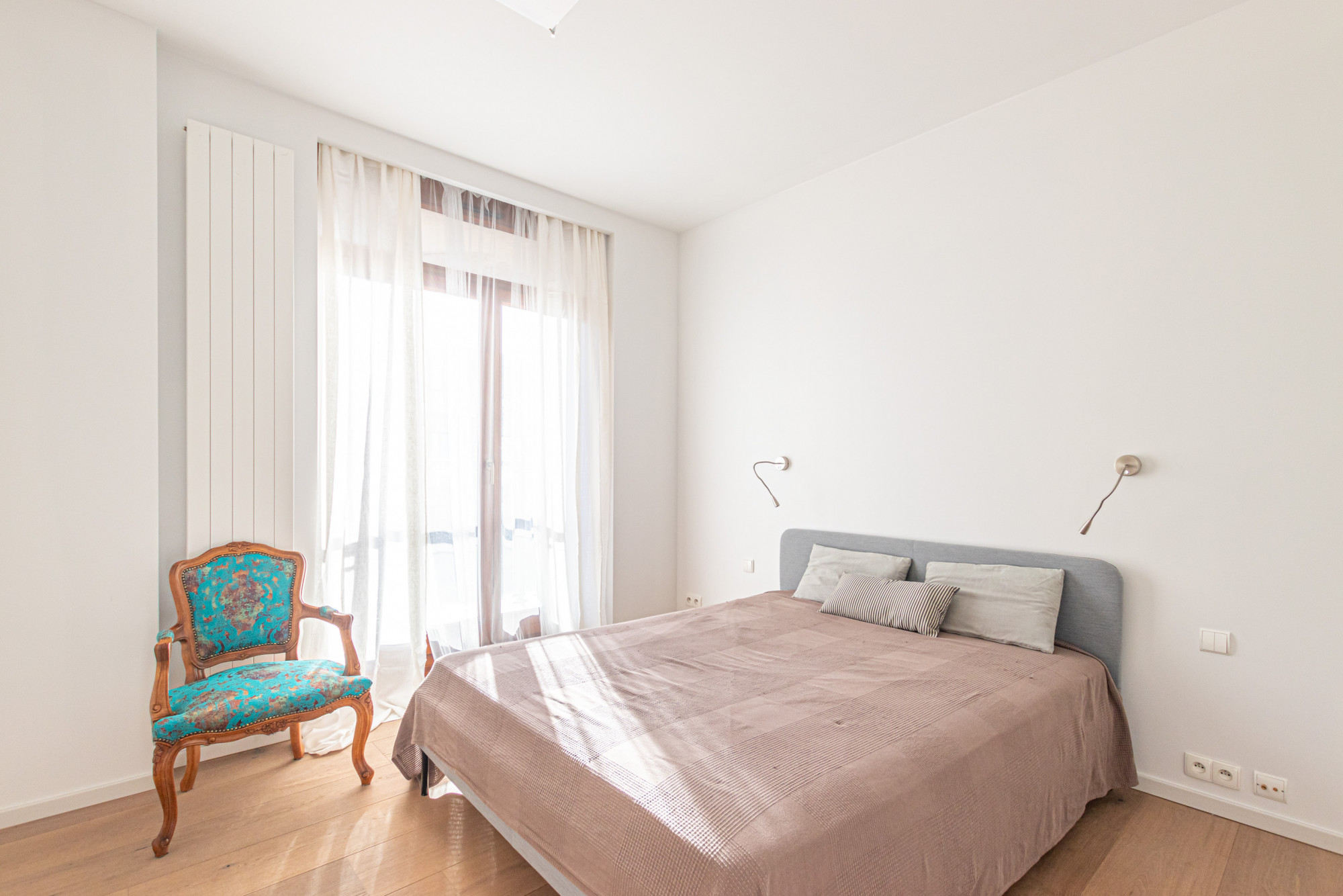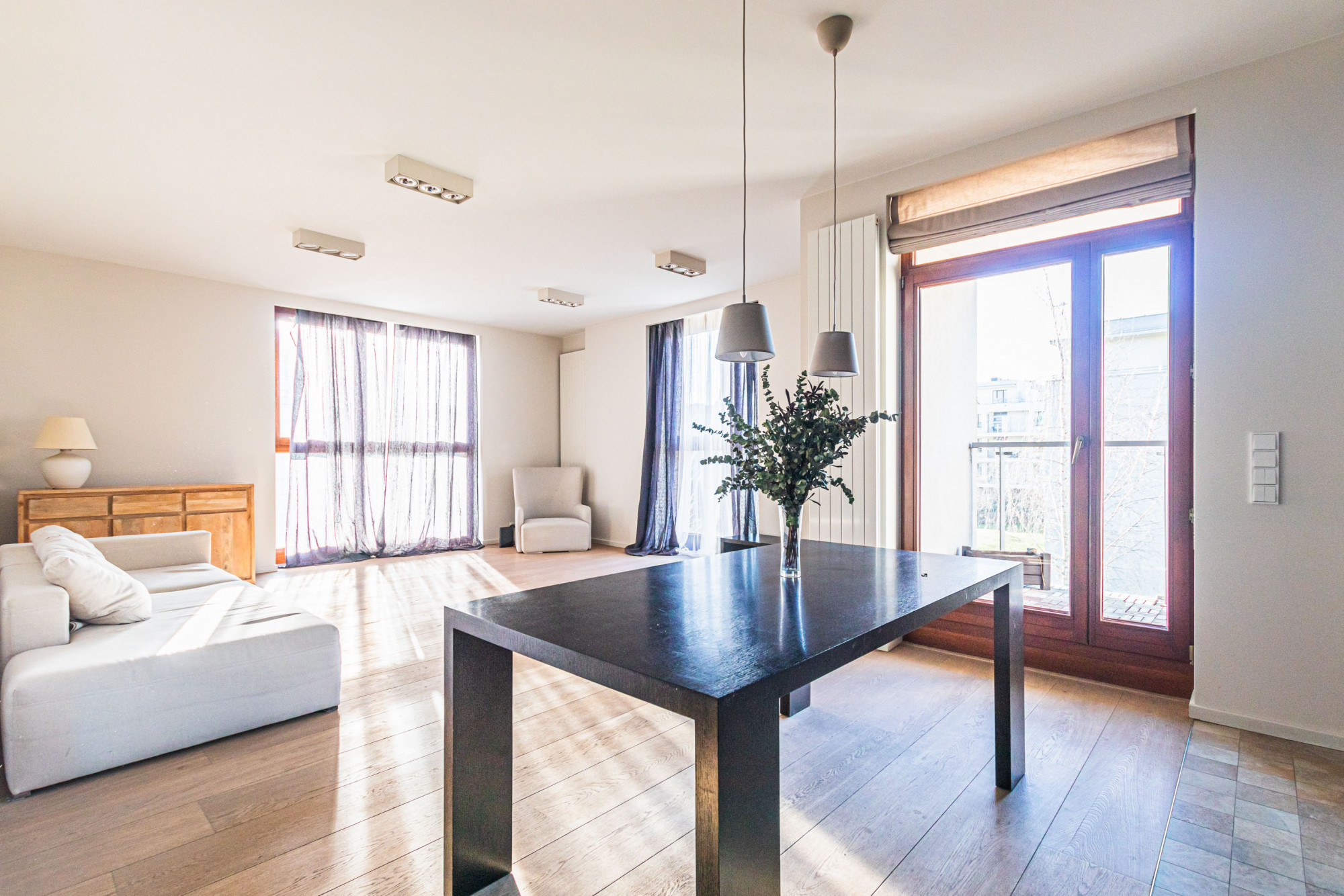 * szerokie drewniane okna na wysokość mieszkania, w oknach zasłony i firanki