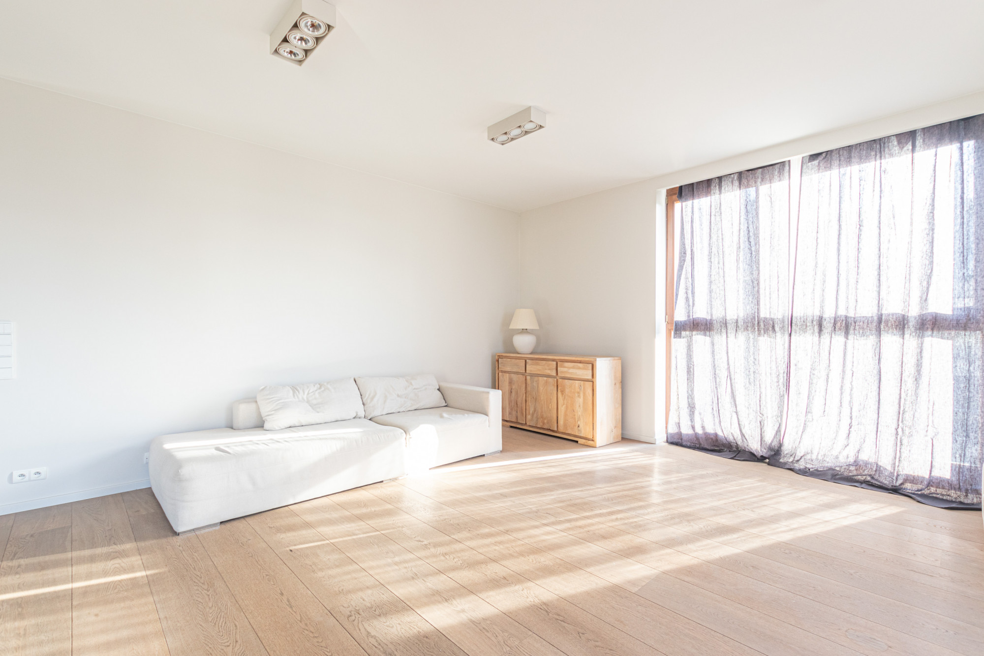 * na podłogach w salonie deska dębowa wysokiej jakości, w dwóch mniejszych pokojach deska barlinecka o jednolitym jasnym kolorycie