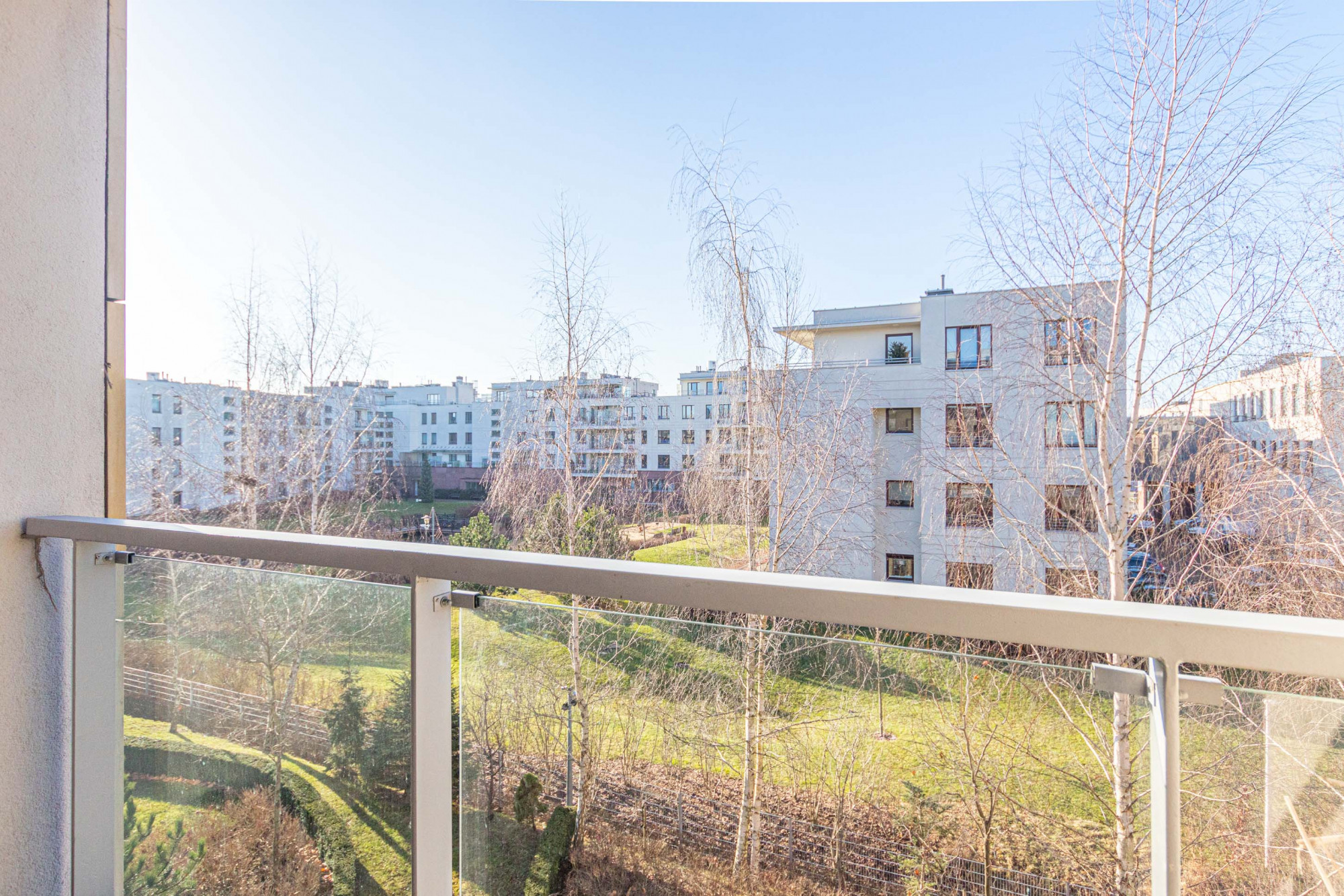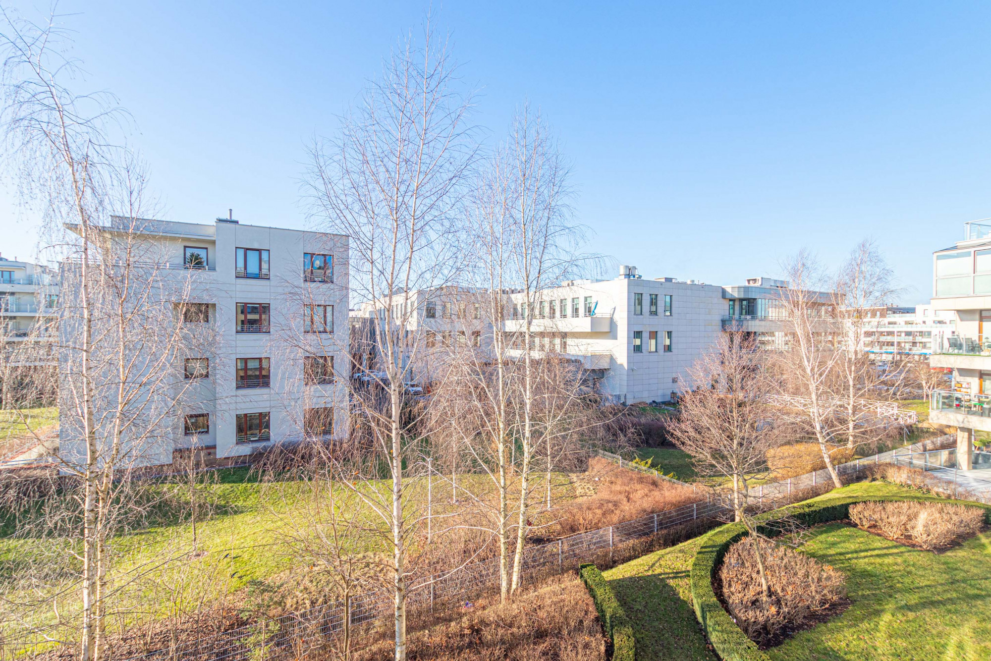 Mieszkanie położone jest w bardzo dobrej lokalizacji. W pobliżu pełna infrastruktura miejska, komunikacja miejska, sklepy, restauracje i kawiarnie, galerie handlowe, przedszkola i szkoły w tym międzynarodowe. Bardzo dobry punkt komunikacyjny, dogodny dojazd do stacji metra Wilanowska (połączenie autobusowe), liczne ścieżki rowerowe i tereny rekreacyjne w pobliżu. Osiedle zamknięte, strzeżone, z hallem i recepcją przy wejściu. Duży, ładny plac zabaw na zamkniętym wewnętrznym dziedzińcu. Piękny widok z okien z perspektywą przestrzenną, jeziorko, drzewa i zadbane trawniki. Bardzo dogodny wyjazd z Miasteczka Wilanów.