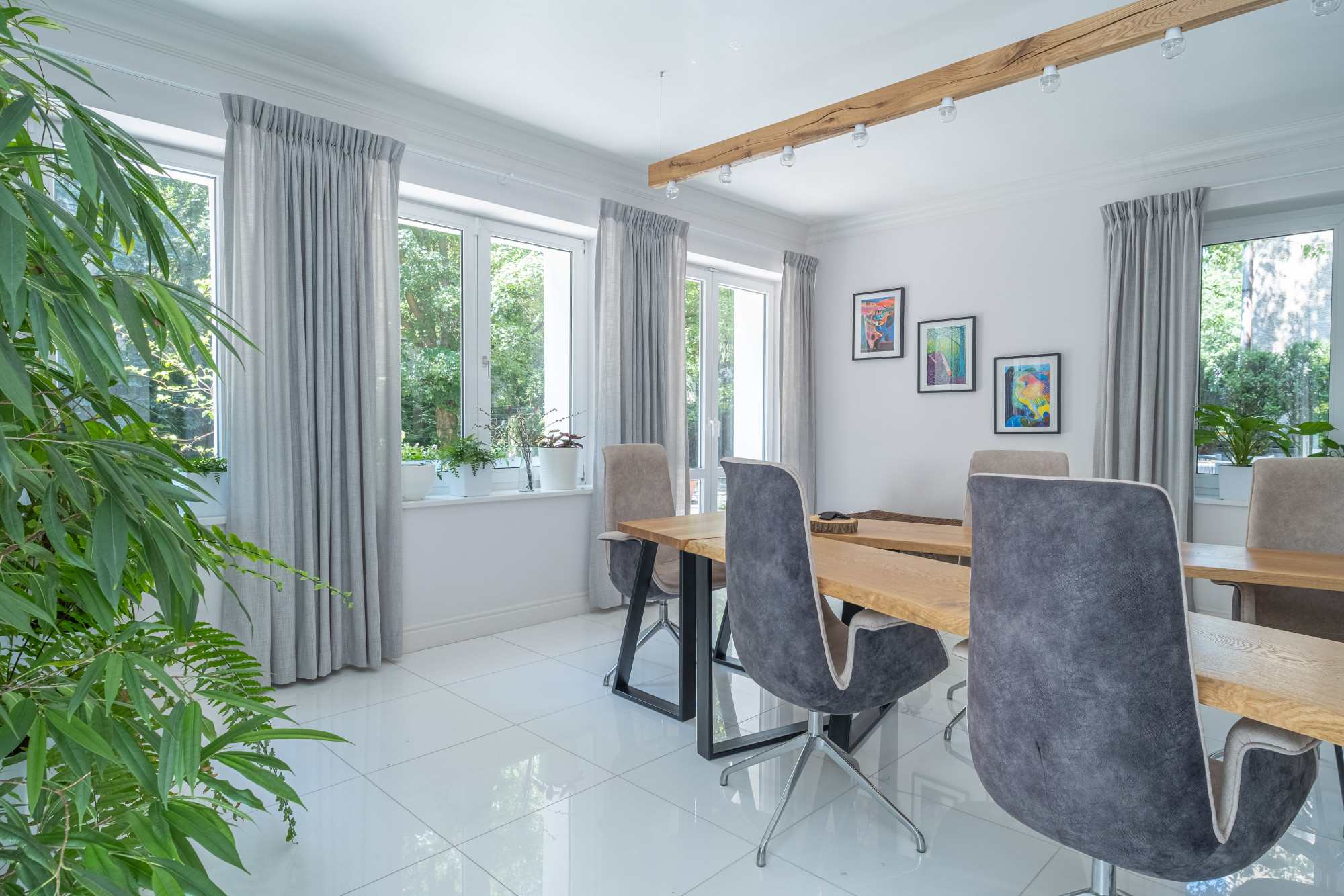 Na powierzchnię domu składa się m.in. salon 34m2 + jadalnia 26m2 z wyjściem na duży taras i do ogrodu, kuchnia, 2 gabinety, 3 duże pokoje, taras 35m2, 3 łazienki, garaż.