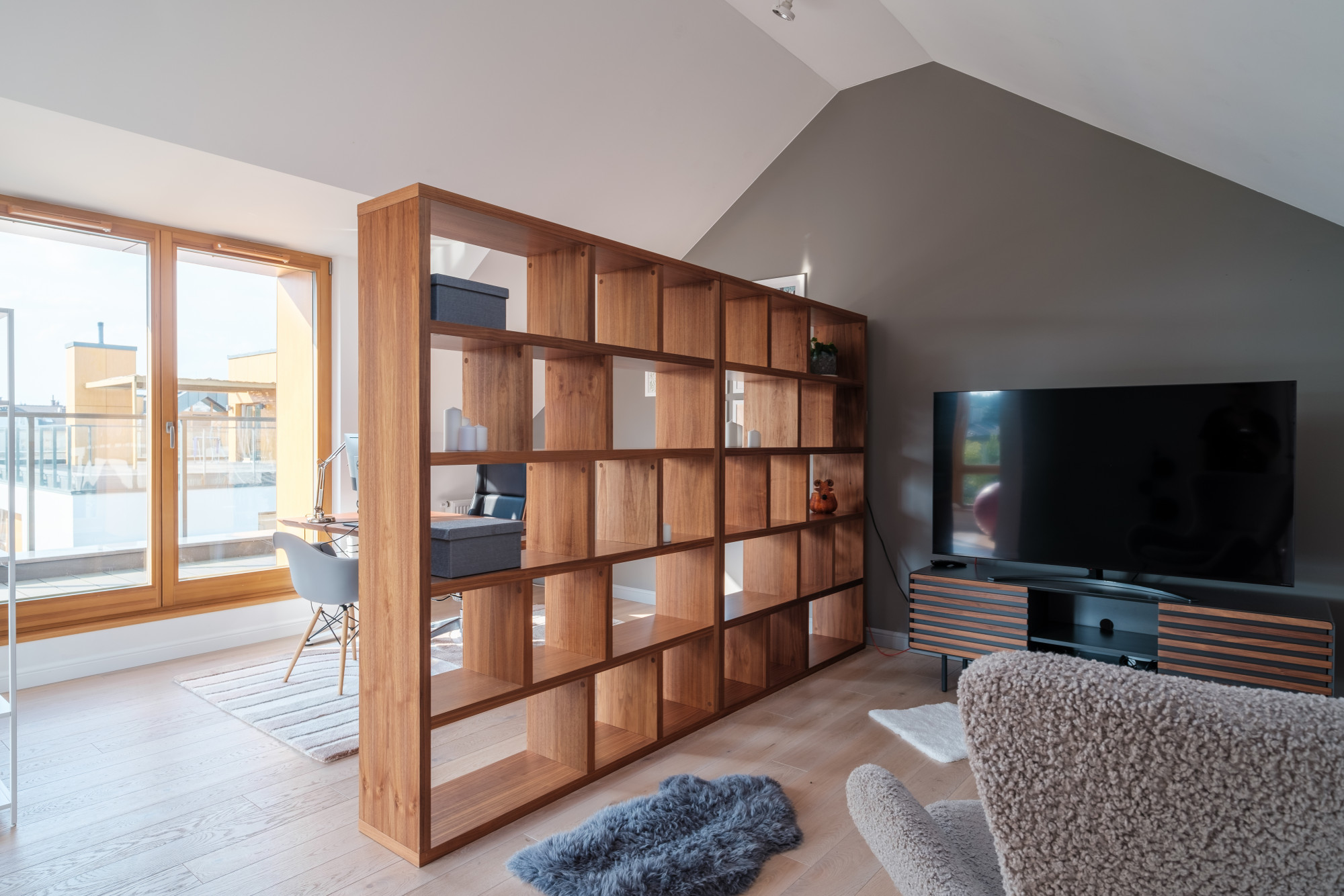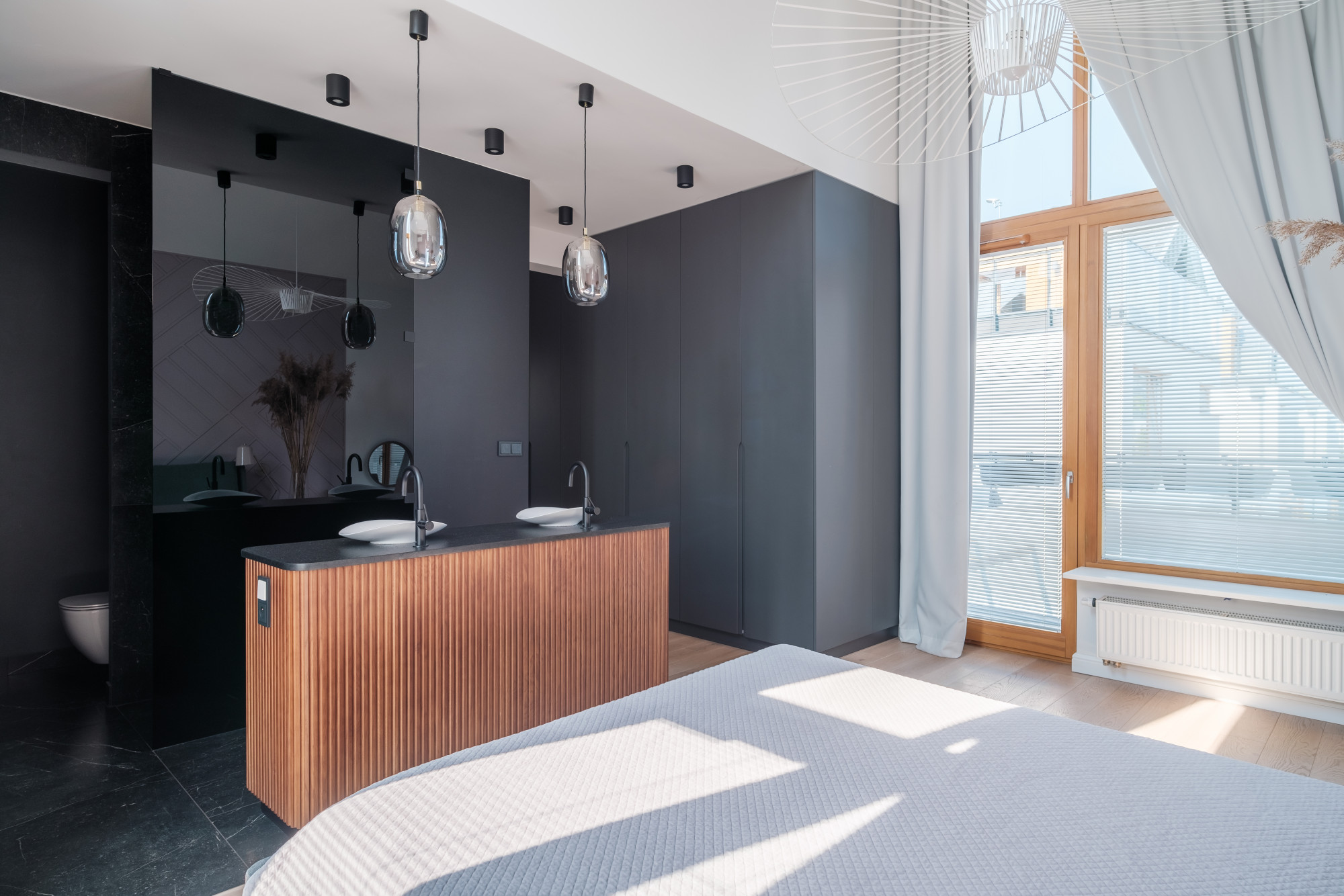 przestronna strefa dzienna (55 m²), 3 sypialnie, gabinet, otwarta przestrzeń na poddaszu, 2 łazienki, toaleta, garaż, taras.