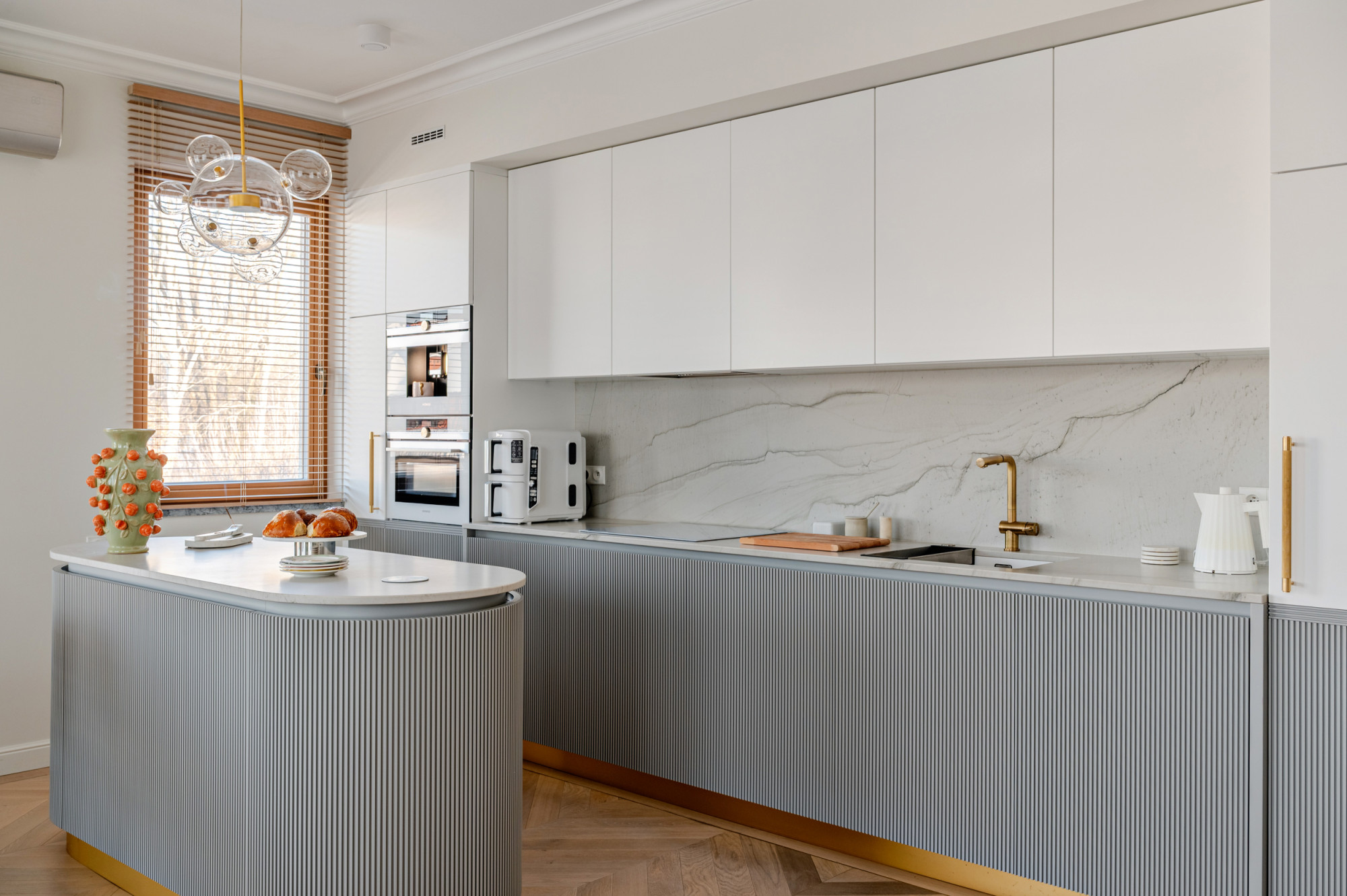 dębowe podłogi, zabudowy na wymiar z forniru dębowego, kamienne blaty oraz starannie dobrane oświetlenie podkreślają elegancki i ponadczasowy charakter nieruchomości.