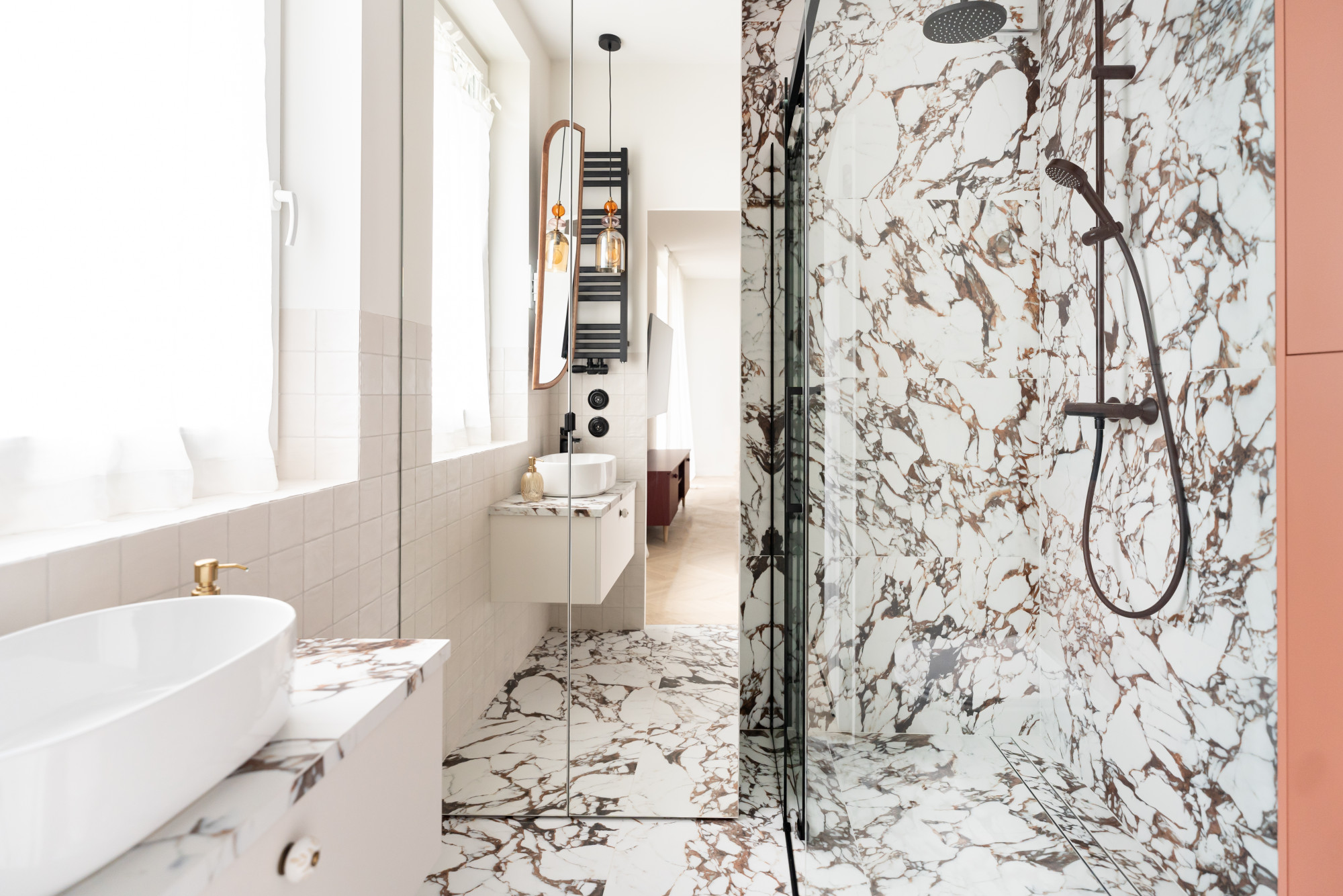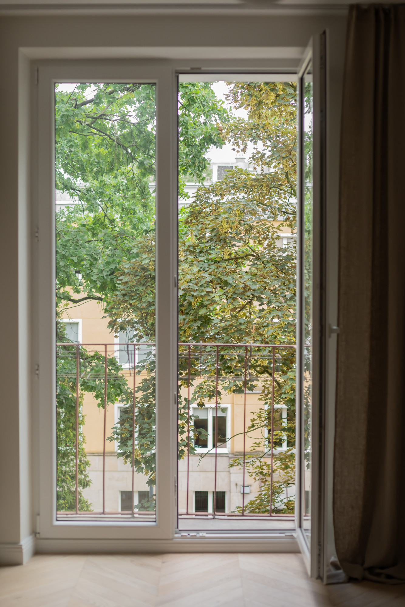 Salon z aneksem kuchennym (31 m²), dwie sypialnie, łazienka z oknem, dwa balkony - jeden z widokiem na Pałac Kultury i Varso Tower. Kuchnia na zamówienie, sprzęt AGD Bosch, cztery pojemne szafy na wymiar. Widok z okien na  ciche, zielone podwórze. Idealne do życia lub pracy zdalnej w sercu miasta.
