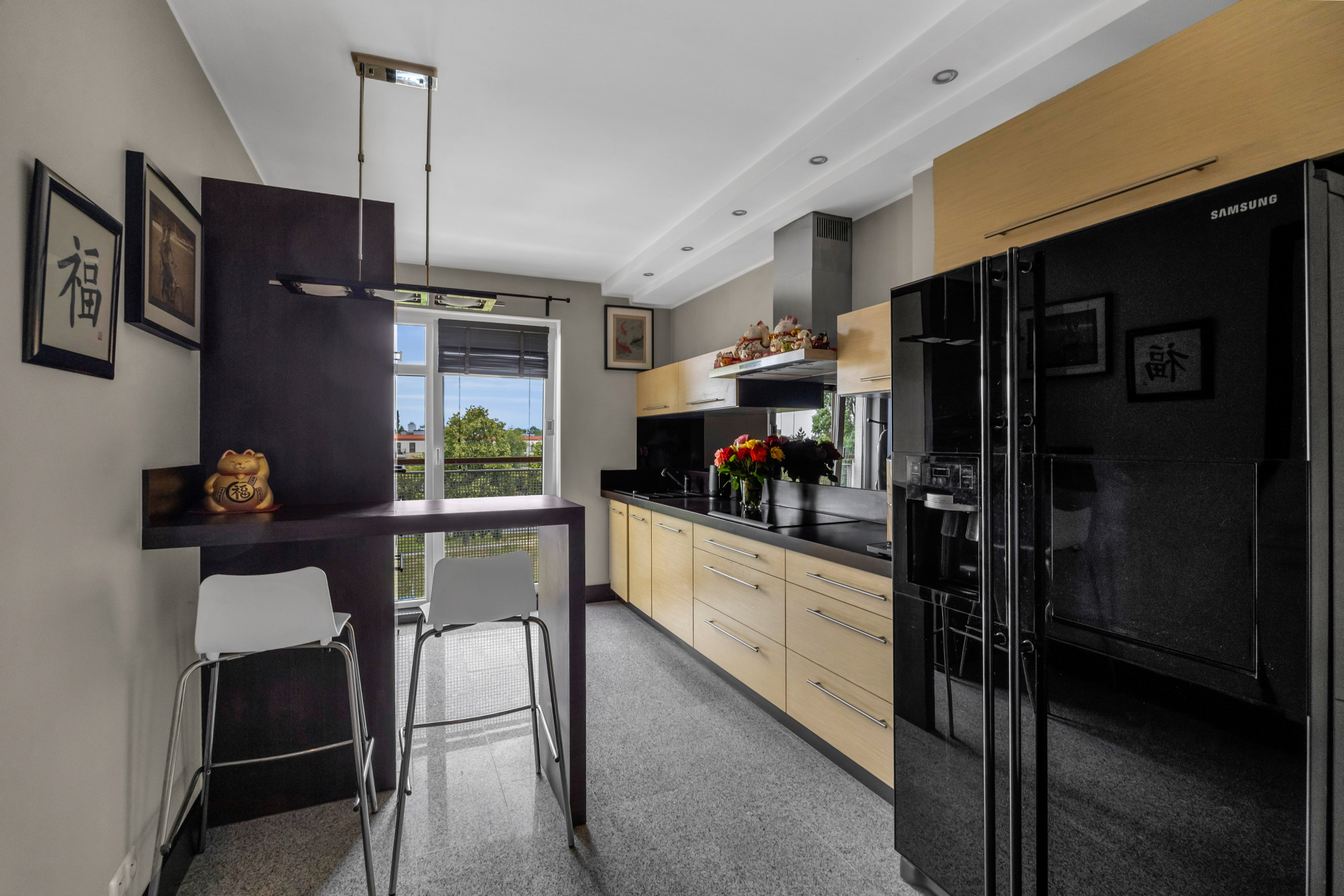 Mieszkanie jest wykończone w wysokim standardzie i gotowe do zamieszkania. Na podłodze znajduje się trwały parkiet z drewna merbau, gres oraz nowe panele wysokiej jakości. Kuchnia wyposażona jest w eleganckie meble i kamienne blaty, a piękne drzwi wewnętrzne dopełniają stylowego wystroju wnętrza. Pierwotnie czteropokojowe mieszkanie zostało zaaranżowane jako trzypokojowe, ale istnieje możliwość łatwego powrotu do układu pierwotnego.