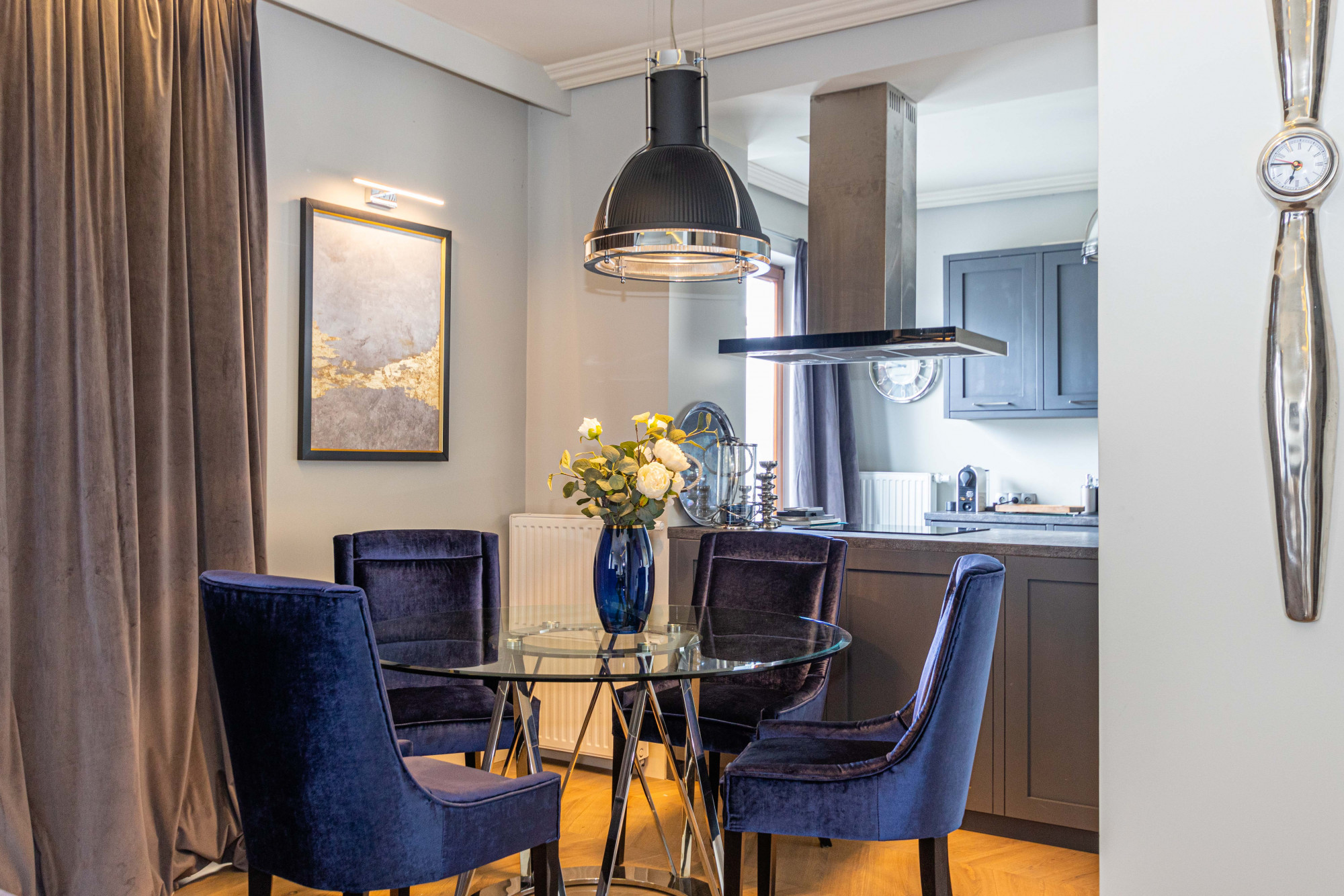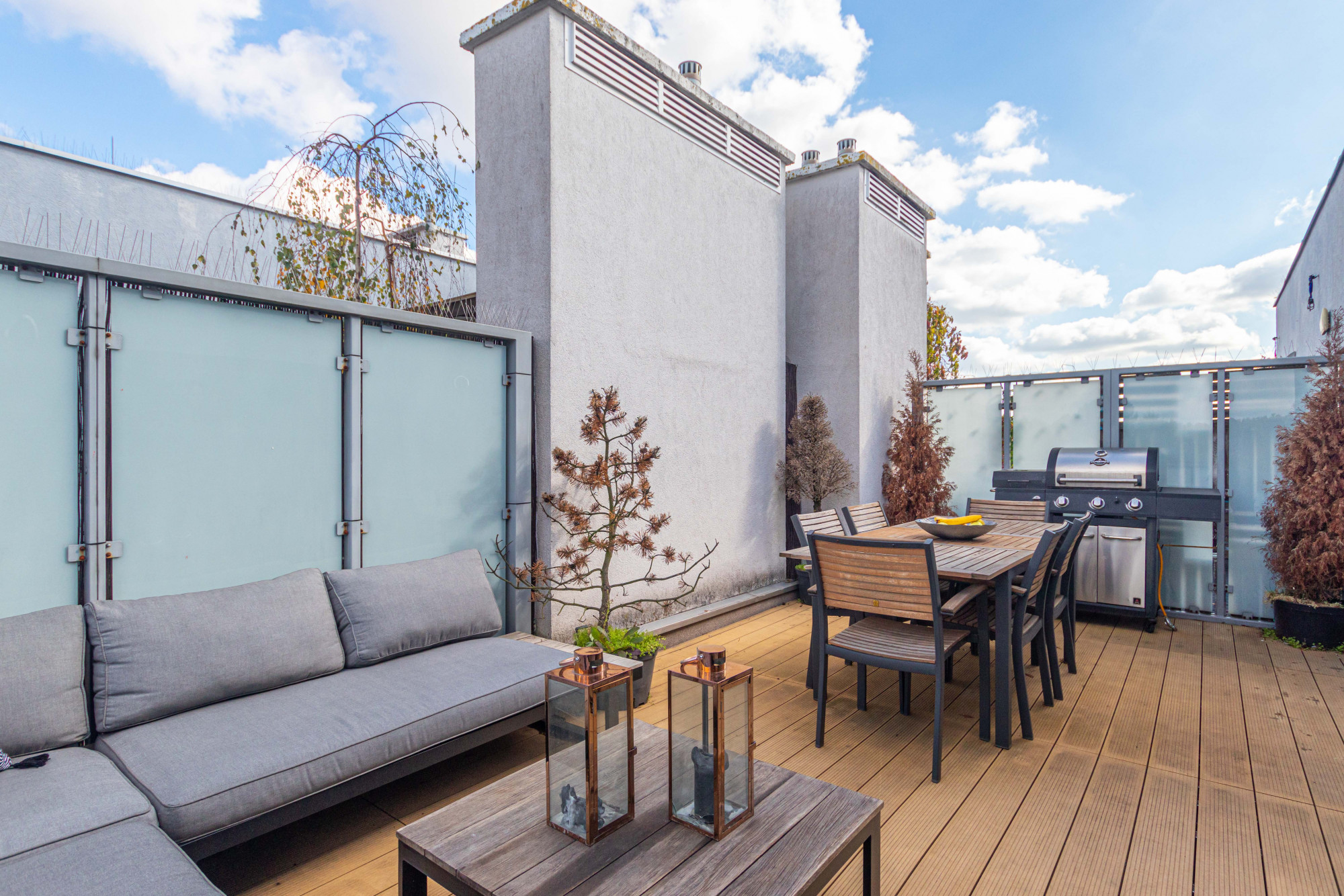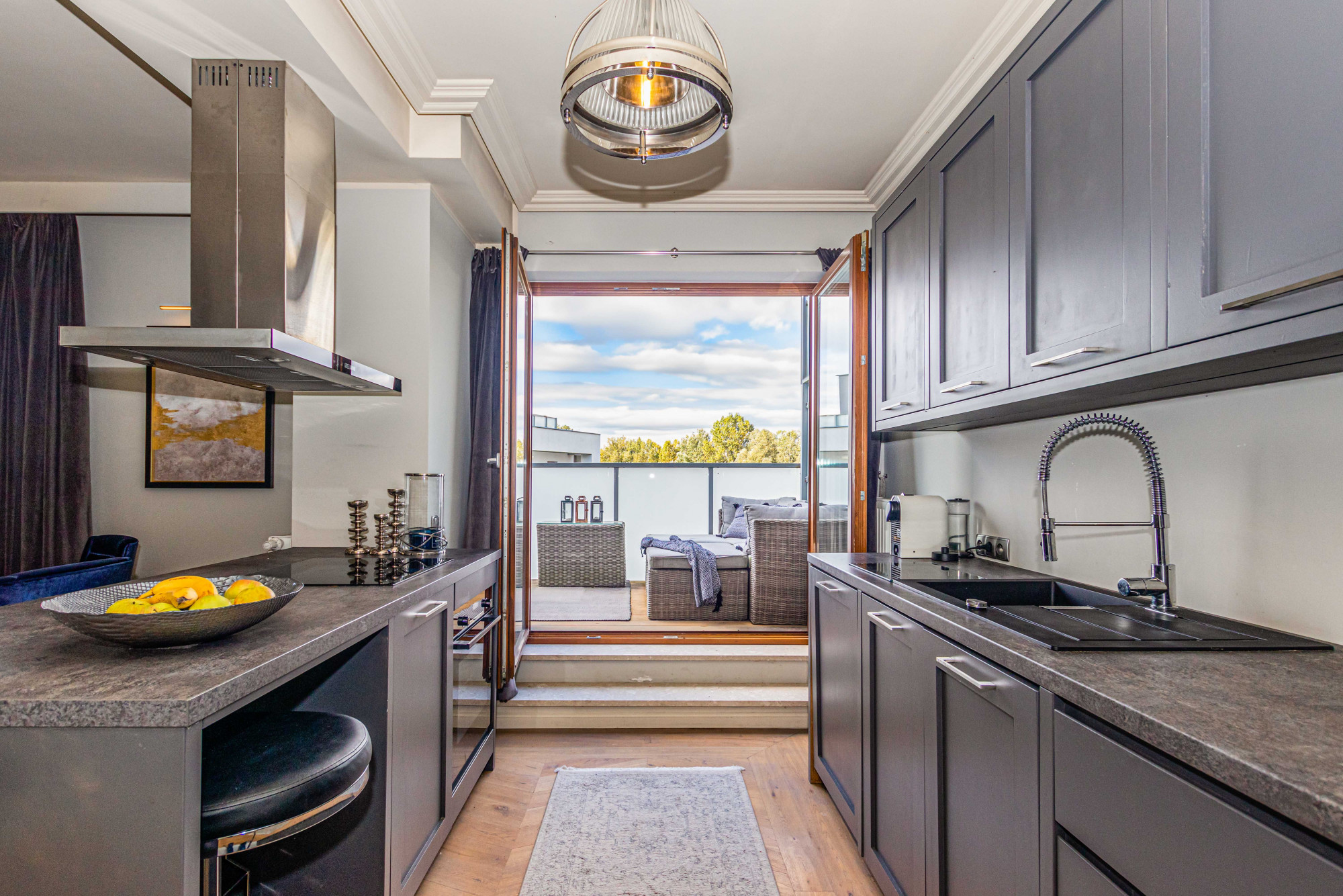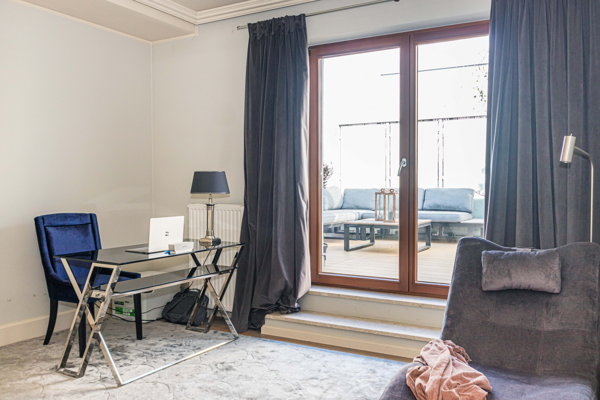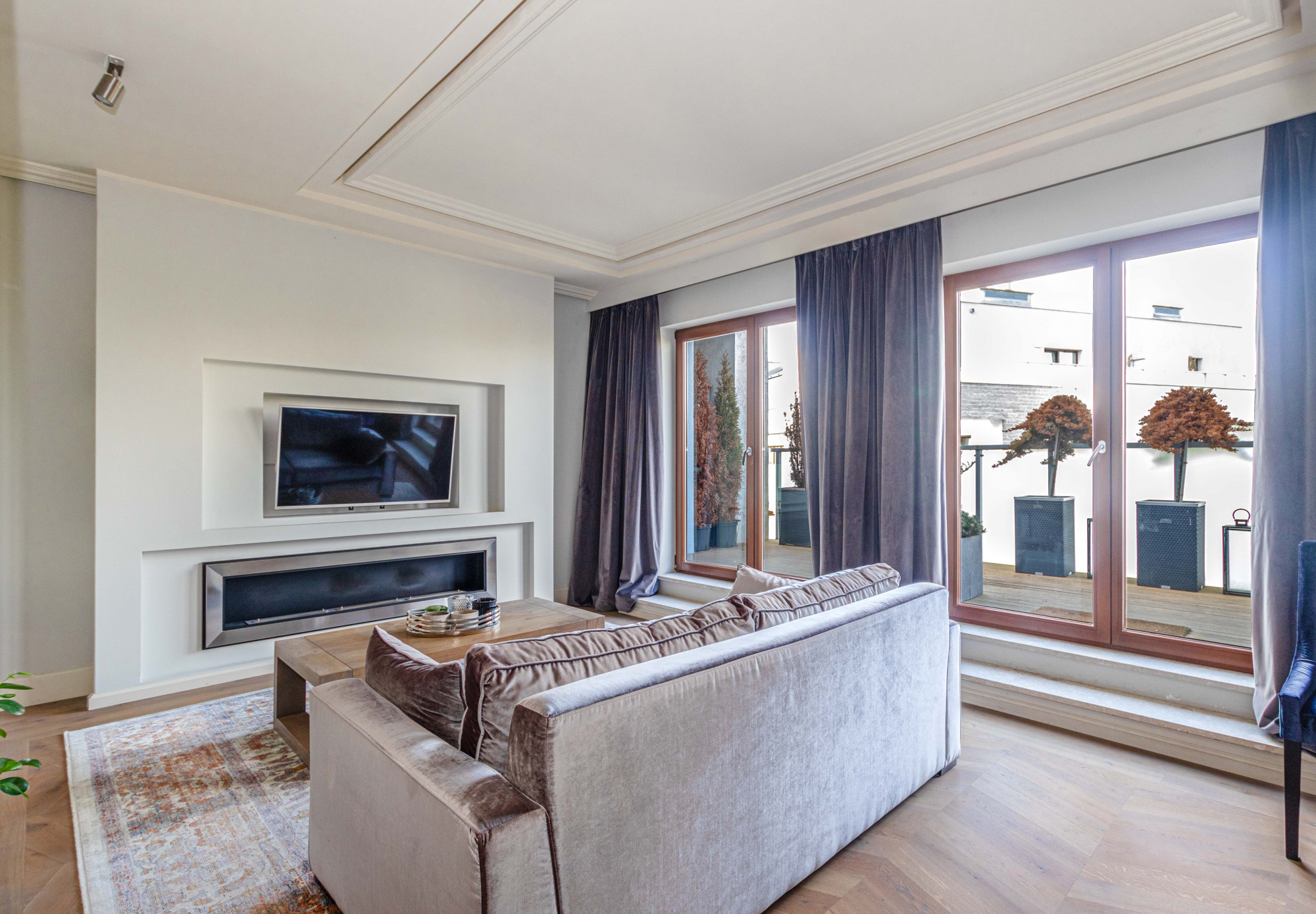 The area registered in the land and mortgage register is 87.21 m², while the actual living area including the built-in mezzanine is 97.88 m². The penthouse was designed by an architect. The modern style combined with classical elements gives the interior a unique appearance. Large wooden windows and carefully selected furniture and accessories provide a sense of comfort and space. A bio-fireplace in the living room will make autumn and winter evenings more enjoyable. The apartment is excellently illuminated with both natural and ambient artificial light.