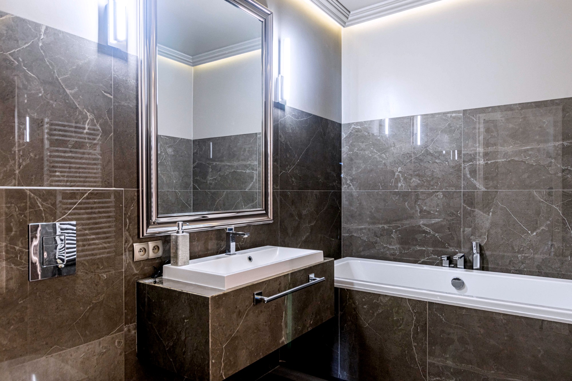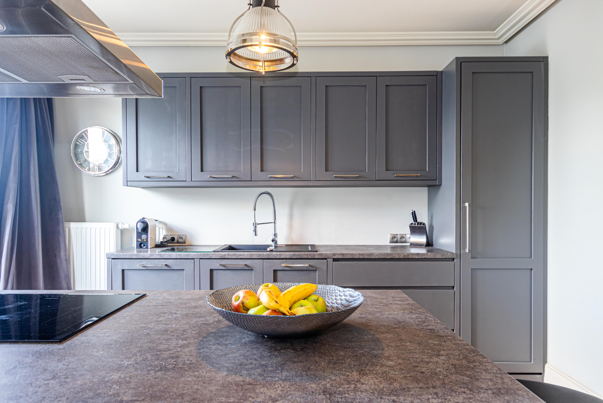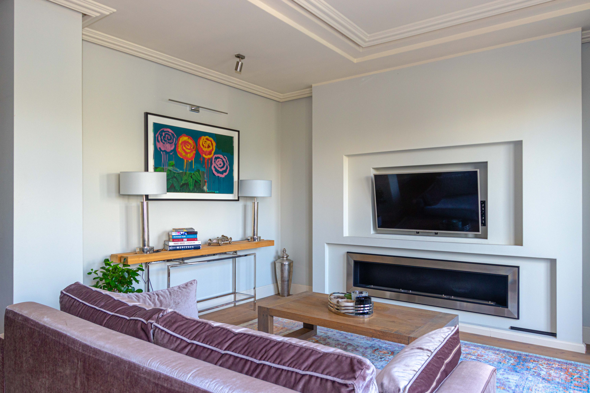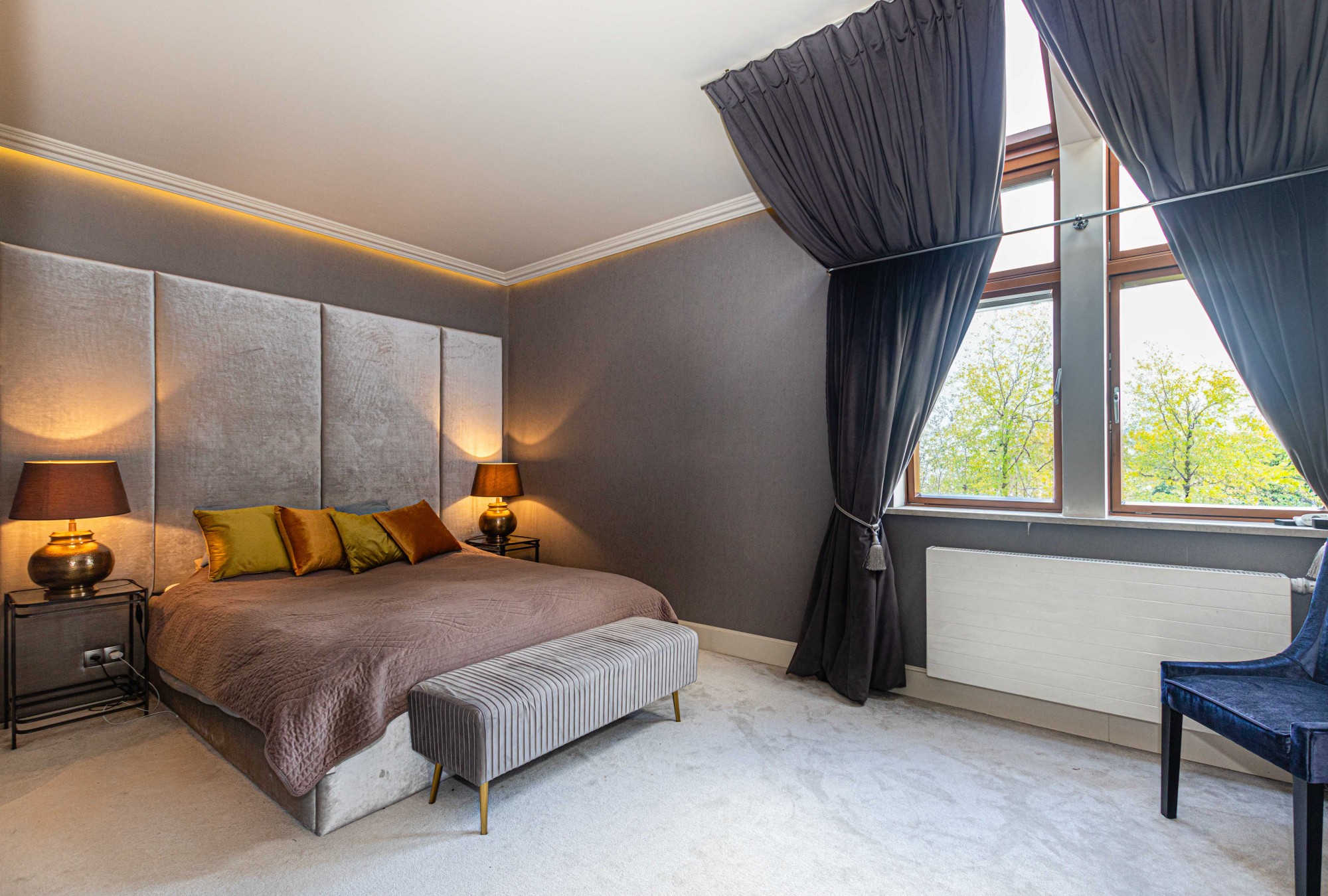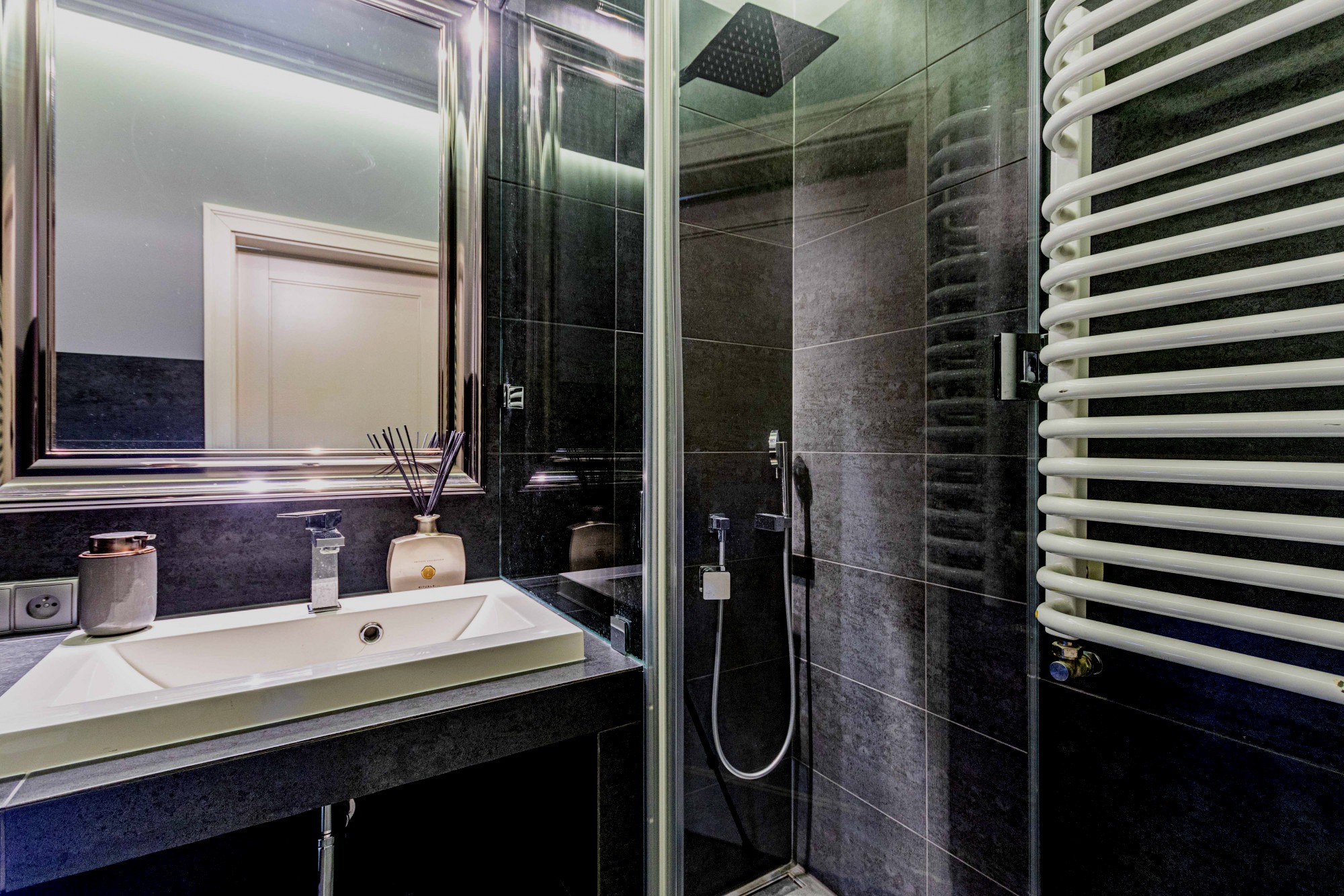 The area registered in the land and mortgage register is 87.21 m², while the actual living area including the built-in mezzanine is 97.88 m². The penthouse was designed by an architect. The modern style combined with classical elements gives the interior a unique appearance. Large wooden windows and carefully selected furniture and accessories provide a sense of comfort and space. A bio-fireplace in the living room will make autumn and winter evenings more enjoyable. The apartment is excellently illuminated with both natural and ambient artificial light.