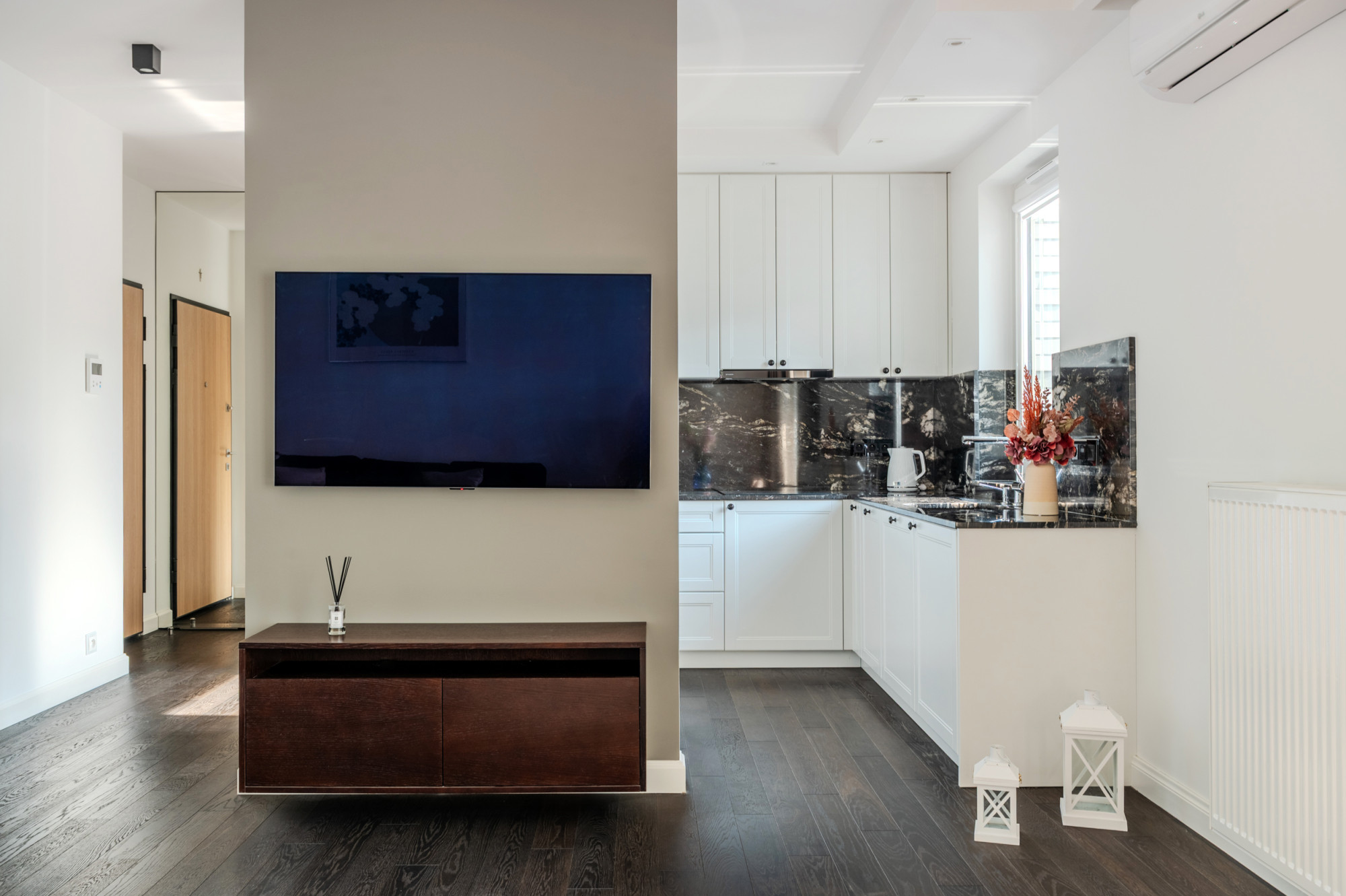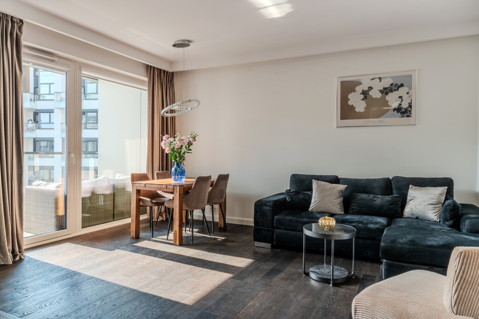Przemyślany układ pomieszczeń, jasna kolorystyka oraz doskonale doświetlone przestrzenie to główne, ale nie wszystkie atuty apartamentu.