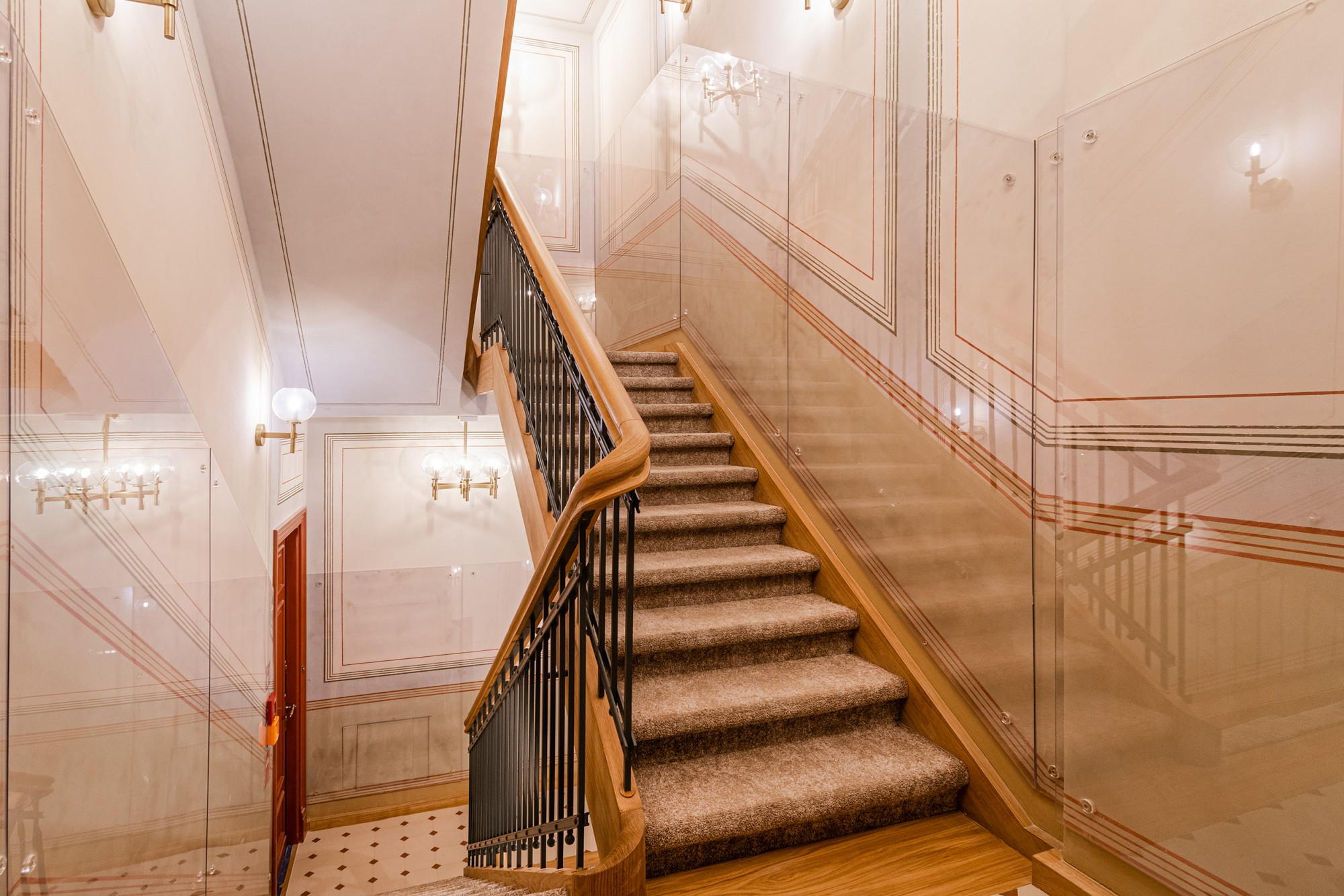 ekskluzywne SPA z jacuzzi i sauną, salę fitness oraz przestronny taras, skąd roztaczają się wspaniałe widoki na centrum Warszawy. Podczas renowacji klatki schodowej zachowano oryginalną polich`romię sufitową i ścienną oraz marmurowe posadzki i drewniane schody.