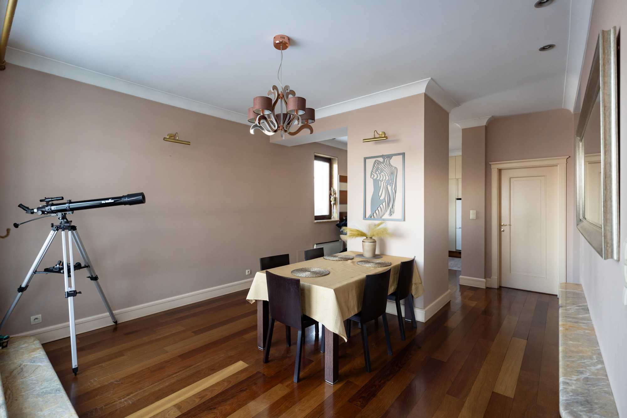 EUROVILLA prezentuje dwupoziomowe mieszkanie o powierzchni 143 m² z tarasem o powierzchni 90 m². Na dolnym poziomie znajduje się część dzienna z salonem, jadalnia z kuchnią, pomieszczenie gospodarcze oraz toaleta dla gości. Na piętro prowadzą drewniane, kręcone schody. Górny poziom obejmuje dwie sypialnie - główną z garderobą oraz mniejszą sypialnię ze skosami - a także łazienkę z wanną i prysznicem. W całym mieszkaniu zastosowano ogrzewanie podłogowe. Lokal oferuje dużą ilość miejsca do przechowywania.